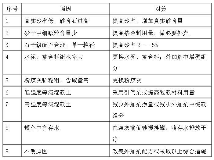 造成這一問題產生的原因是:由配比材料的綜合因素引起,砂率偏低、外加劑緩凝組分較多等,具體可參考下表: